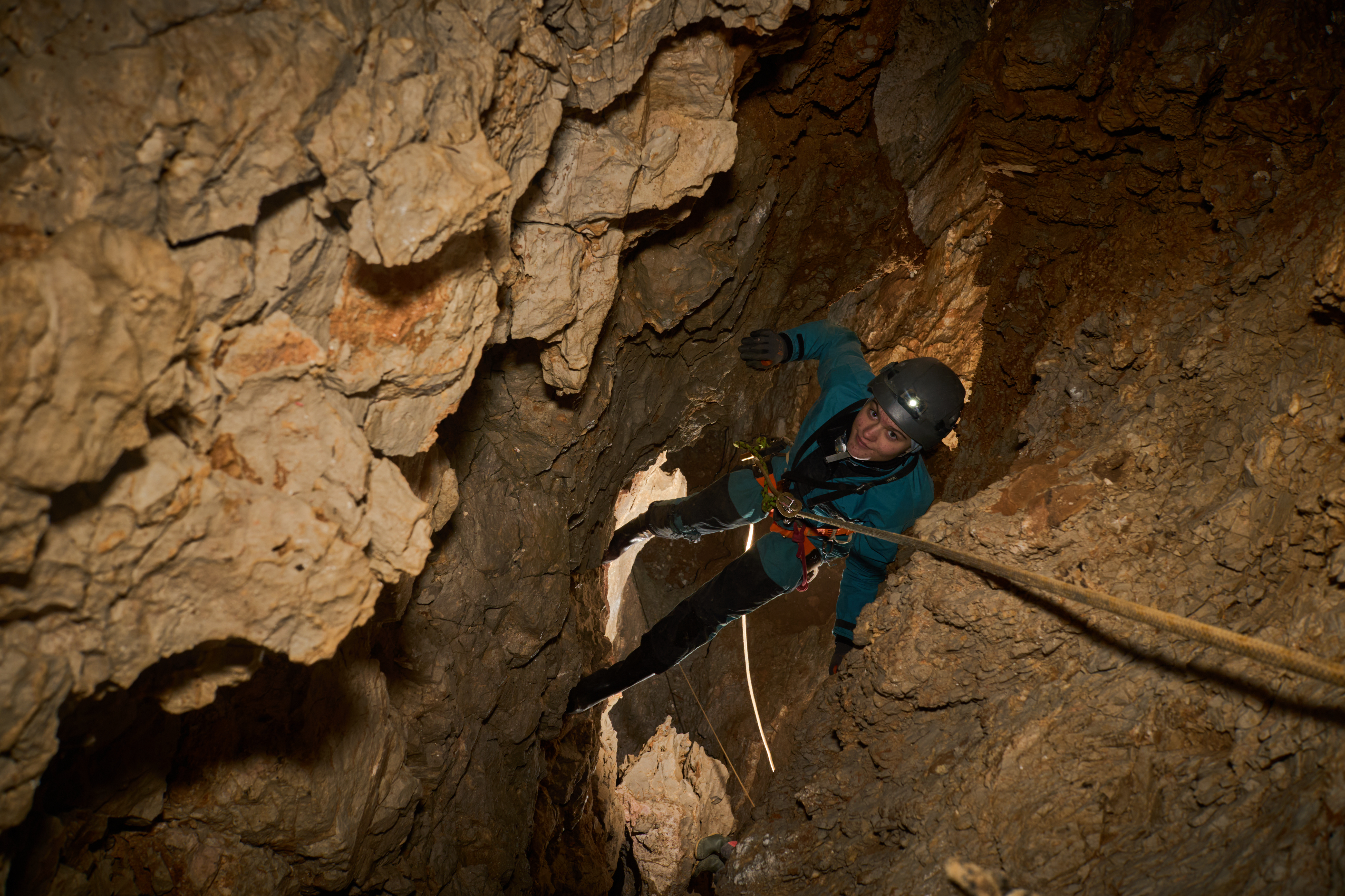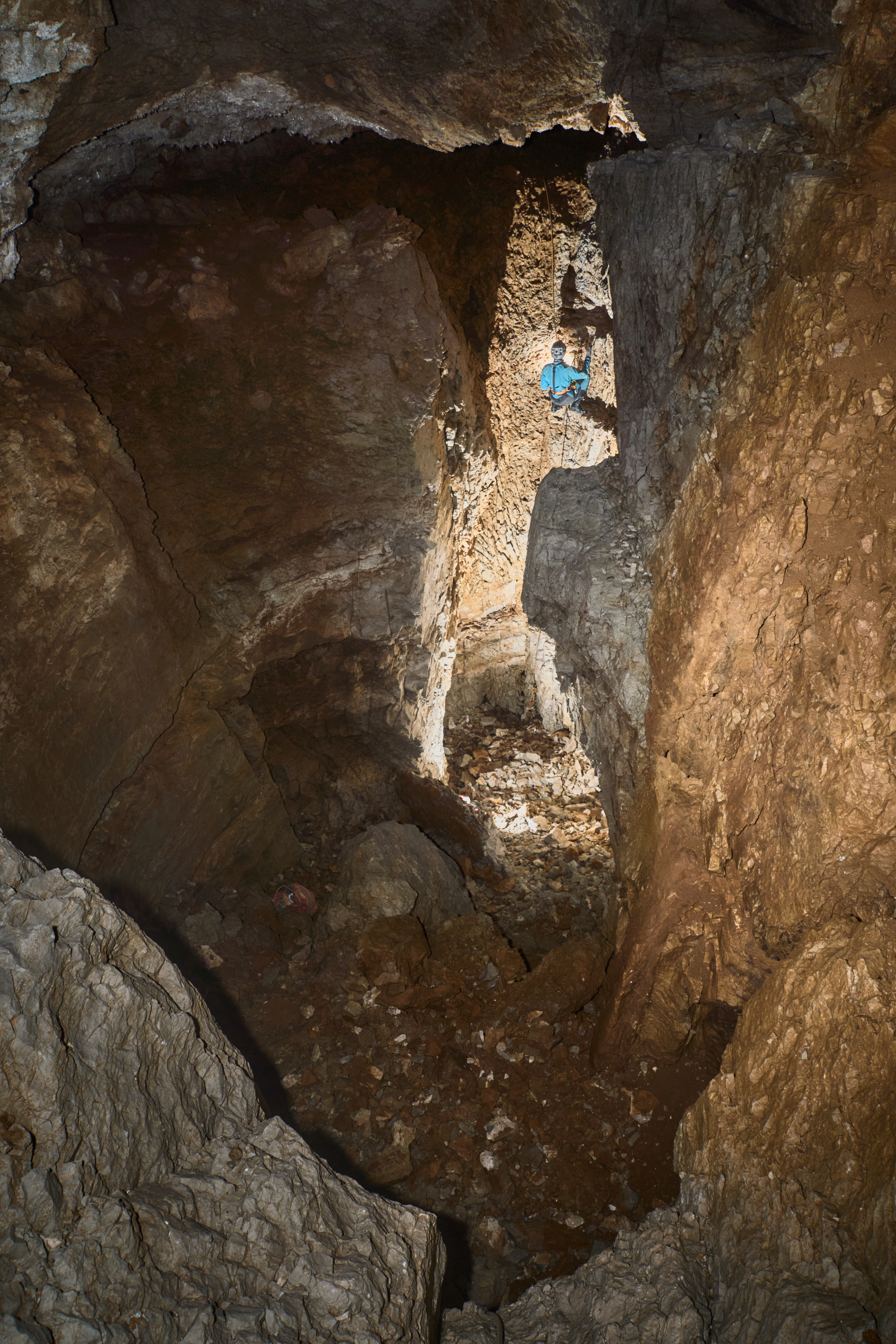 Tri metre naprej naju je pričakala petmetrska stopnja, navzdol, rov se je odprl v kamro. Skoraj bi se jo dalo prosto preplezati, a sva se vseeno dolgo zamudila, da sva jo opremila, saj so stene močno krušljive. Pod stopnjo se je rov ožil in se po treh metrih prevesil v brezno, očitno pregloboko za opremo, ki sva jo imela pri sebi. Na povratku sva jamo izmerila in Tim se je pritoževal, ker se jama nadaljuje, češ da ima navado delo dokončati že ob prvem obisku. Še zdaj ne vem, koliko je bil sarkastičen in koliko resen.