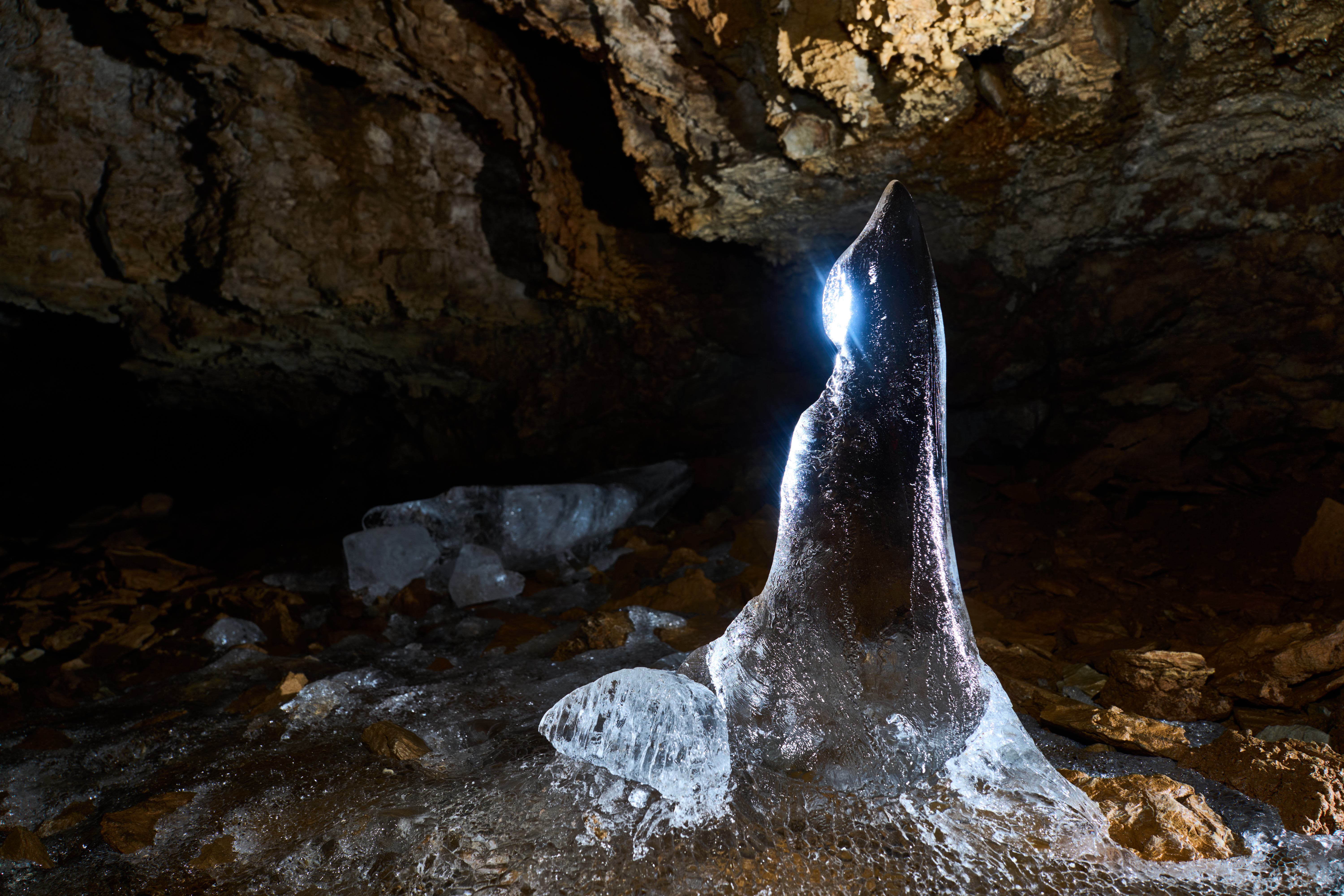 Prvo neraziskano brezno nas je čisto preveč navdušilo, tako da smo vanj spustili 60 metrov vrvi, globoko pa je bilo 25. Je široko, ob prelomu, pridruži se mu kamin, v njem visi tudi kak stalaktit. Brezno, ali pa njegovo dno, smo po nenavadnem okusu sladkarije poimenovali Limonada iz rabarbare. Dno je sicer presneto zanimivo. Z živoskalnih polic se spustimo na podor in po njem v žleb, ki se po desetih metrih konča. Prava zanimivost je lezika nekaj metrov nad dnom, rov se nadaljuje po preseku te in omenjenega preloma. Po levi steni Limonade sem splezal na blatno polico in se splazil po njej do nadaljevanja, ga na hitro preveril in opremil vzpon vanj. Podorni rov nas je vodil pretežno navzgor, se po dvajsetih metrih skoraj zaprl, se nenadoma spet odprl in se strmo spustil za dvajset metrov, tako da smo spet opremljali. Spuščali smo se ob ledenem slapu, pristali pa na pravem malem ledeniku. Od tam smo šli naprej v isto smer, tokrat po podoru navzgor, in že po nekaj metrih smo se znašli v dvorani, v katero vsepovsod kaplja iz kaminov.